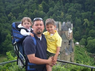 Daddy and Hyland inside Castle Eltz courtyard awaiting the tour.